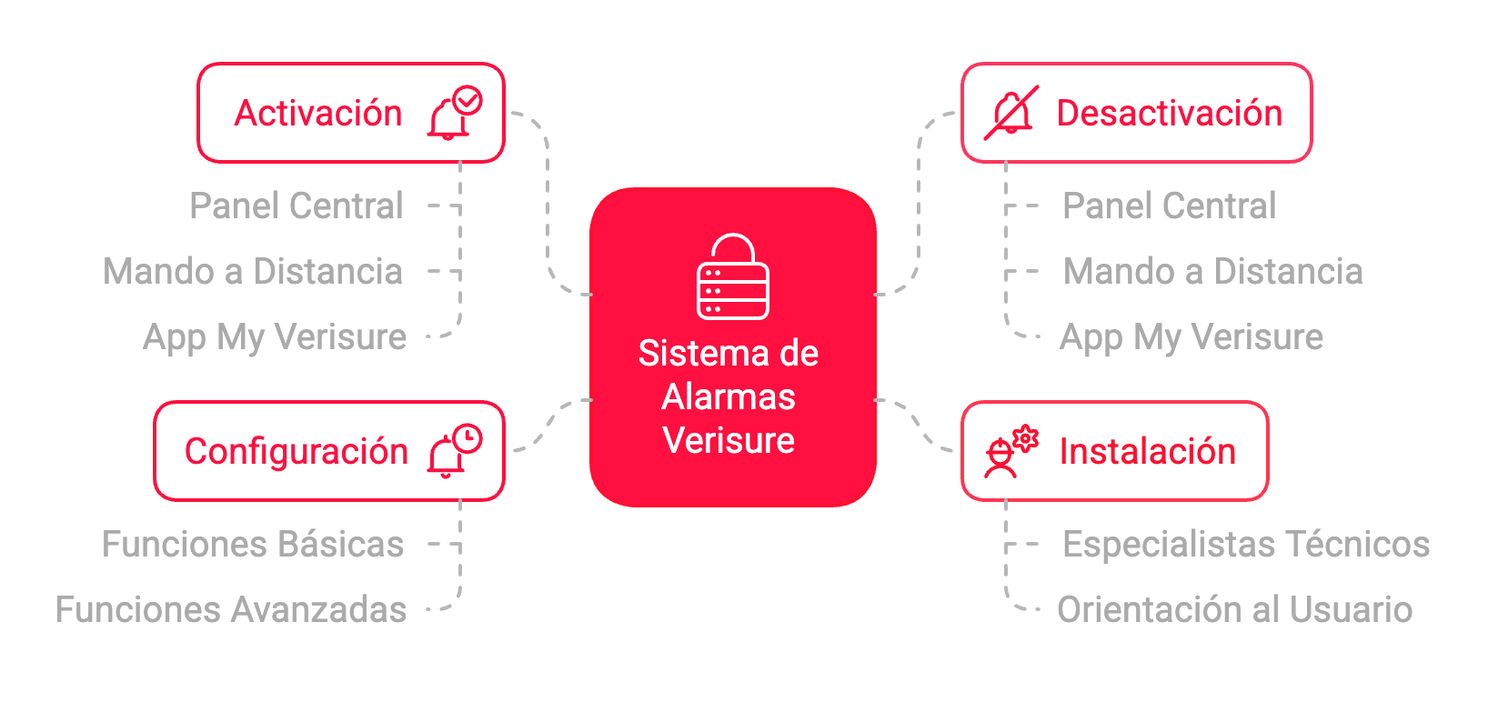 Para cambiar las configuraciones o desconfigurar la alarma, el usuario puede acceder a la interfaz del sistema mediante los diversos métodos disponibles anteriormente mencionados: llave electromagnética, mando a distancia, Panel de Control y app My Verisure, para cambiar cualquier función o valores dentro de las configuraciones de seguridad.